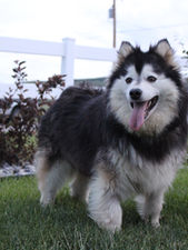 Gracie is our second generation (F2) pomsky. She has a pomsky father and a pomsky mother. She is the largest of our pomsky mommas. She is 16" tall and weigh 35 pounds. She LOVES water, belly rubs and to show off her speedy zooms. She gave us 2 stunning litters and is now retired and living the water dog and daddy snuggles life.